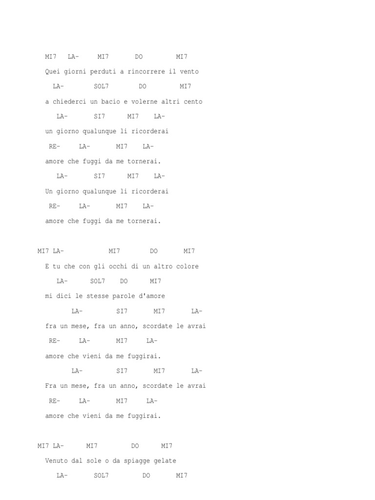 Venuto dal sole o da spiagge gelate venuto in novembre o col vento d'estate io t'ho amato sempre, non t'ho amato mai amore che vieni, amore che vai io t'ho amato sempre accordi. Che strano amore questo amore. Scopri i nostri corsi di chitarra per tutti i livelli. Quei giorni perduti a rincorrere il vento a. Amore che verrai vivir julio iglesias.